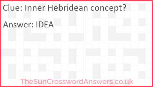 Inner Hebridean concept? is a crossword clue for which we have 1 possible answer and we have spotted 3 times in our database. This crossword clue was last seen on 09 February 2025 in The Sun Cryptic Crossword puzzle!