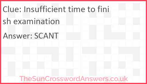 Insufficient time to finish examination is a crossword clue for which we have 1 possible answer and we have spotted 3 times in our database. This crossword clue was last seen on 20 July 2025 in The Sun Cryptic Crossword puzzle!