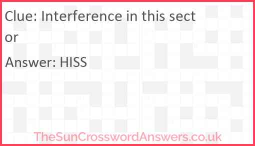 Interference in this sector is a crossword clue for which we have 1 possible answer and we have spotted 2 times in our database. This crossword clue was last seen on 15 March 2023 in The Sun Cryptic Crossword puzzle!