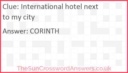 International hotel next to my city is a crossword clue for which we have 1 possible answer and we have spotted 2 times in our database. This crossword clue was last seen on 29 November 2024 in The Sun Cryptic Crossword puzzle!