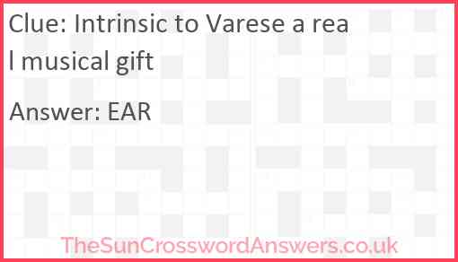 Intrinsic to Varese a real musical gift is a crossword clue for which we have 1 possible answer and we have spotted 4 times in our database. This crossword clue was last seen on 07 December 2024 in The Sun Cryptic Crossword puzzle!