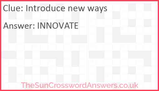 Introduce new ways is a crossword clue for which we have 1 possible answer and we have spotted 2 times in our database. This crossword clue was last seen on 12 September 2023 in The Sun Coffee Time Crossword puzzle!