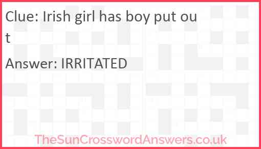 Irish girl has boy put out is a crossword clue for which we have 1 possible answer and we have spotted 1 times in our database. This crossword clue was last seen on 19 January 2019 in The Sun Cryptic Crossword puzzle!
