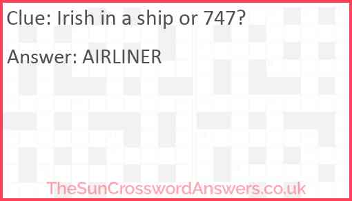 Irish in a ship or 747? is a crossword clue for which we have 1 possible answer and we have spotted 3 times in our database. This crossword clue was last seen on 19 February 2024 in The Sun Cryptic Crossword puzzle!