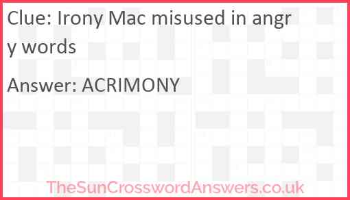 Irony Mac misused in angry words is a crossword clue for which we have 1 possible answer and we have spotted 1 times in our database. This crossword clue was last seen on 13 December 2020 in The Sun Cryptic Crossword puzzle!
