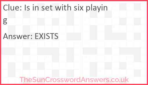 Is in set with six playing is a crossword clue for which we have 1 possible answer and we have spotted 1 times in our database. This crossword clue was last seen on 18 April 2021 in The Sun Cryptic Crossword puzzle!