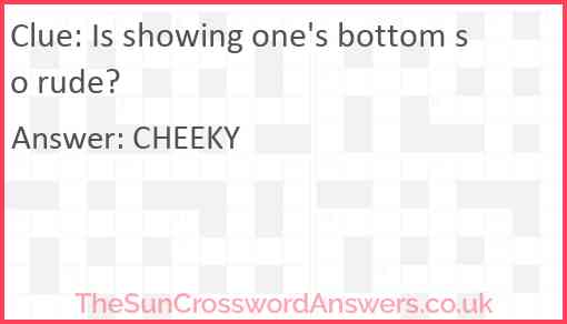 Is showing one's bottom so rude? is a crossword clue for which we have 1 possible answer and we have spotted 1 times in our database. This crossword clue was last seen on 23 February 2025 in The Sun Cryptic Crossword puzzle!