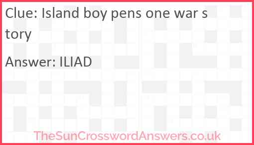 Island boy pens one war story is a crossword clue for which we have 1 possible answer and we have spotted 4 times in our database. This crossword clue was last seen on 08 January 2025 in The Sun Cryptic Crossword puzzle!
