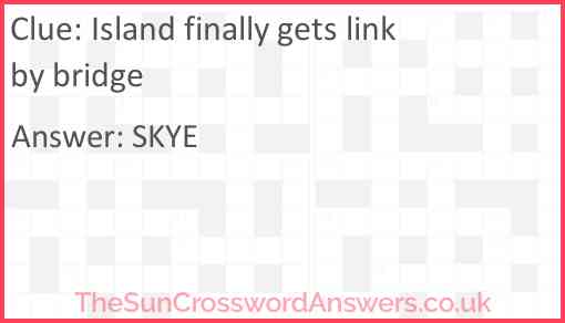 Island finally gets link by bridge is a crossword clue for which we have 1 possible answer and we have spotted 3 times in our database. This crossword clue was last seen on 03 April 2022 in The Sun Cryptic Crossword puzzle!