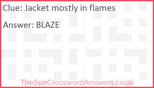 Jacket mostly in flames is a crossword clue for which we have 1 possible answer and we have spotted 5 times in our database. This crossword clue was last seen on 01 November 2024 in The Sun Cryptic Crossword puzzle!