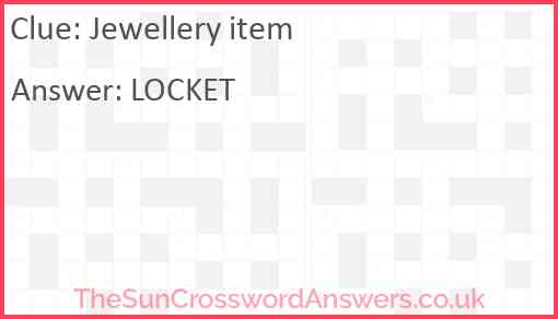 Jewellery item is a crossword clue for which we have 2 possible answer and we have spotted 5 times in our database. This crossword clue was last seen on 18 March 2024 in The Sun Coffee Time Crossword puzzle!