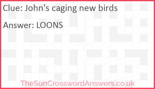 John's caging new birds is a crossword clue for which we have 1 possible answer and we have spotted 1 times in our database. This crossword clue was last seen on 02 March 2023 in The Sun Cryptic Crossword puzzle!