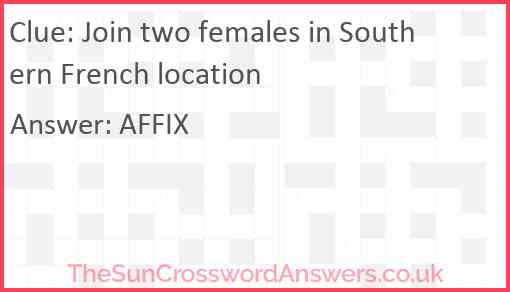 Join two females in Southern French location is a crossword clue for which we have 1 possible answer and we have spotted 1 times in our database. This crossword clue was last seen on 25 February 2019 in The Sun Cryptic Crossword puzzle!