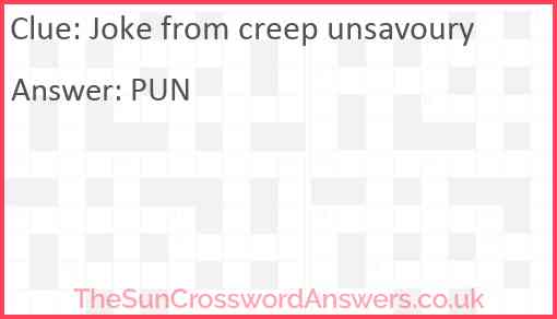 Joke from creep unsavoury is a crossword clue for which we have 1 possible answer and we have spotted 1 times in our database. This crossword clue was last seen on 26 December 2018 in The Sun Cryptic Crossword puzzle!