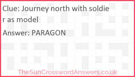 Journey north with soldier as model is a crossword clue for which we have 1 possible answer and we have spotted 1 times in our database. This crossword clue was last seen on 18 April 2024 in The Sun Cryptic Crossword puzzle!