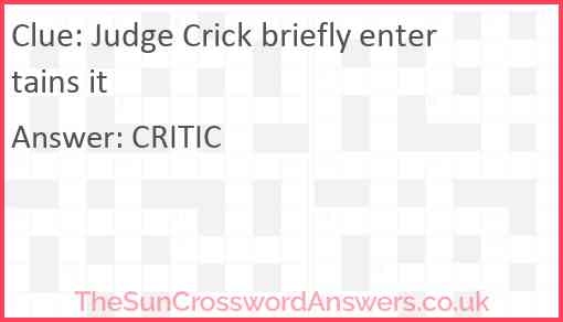 Judge Crick briefly entertains it is a crossword clue for which we have 1 possible answer and we have spotted 2 times in our database. This crossword clue was last seen on 01 June 2022 in The Sun Cryptic Crossword puzzle!