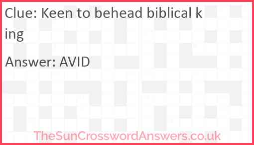 Keen to behead biblical king is a crossword clue for which we have 1 possible answer and we have spotted 2 times in our database. This crossword clue was last seen on 29 December 2023 in The Sun Cryptic Crossword puzzle!