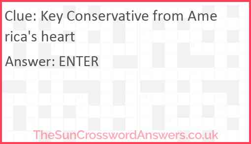 Key Conservative from America's heart is a crossword clue for which we have 1 possible answer and we have spotted 1 times in our database. This crossword clue was last seen on 23 January 2025 in The Sun Cryptic Crossword puzzle!