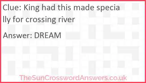 King had this made specially for crossing river is a crossword clue for which we have 1 possible answer and we have spotted 2 times in our database. This crossword clue was last seen on 25 December 2024 in The Sun Cryptic Crossword puzzle!