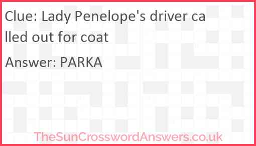Lady Penelope's driver called out for coat is a crossword clue for which we have 1 possible answer and we have spotted 2 times in our database. This crossword clue was last seen on 14 December 2024 in The Sun Cryptic Crossword puzzle!