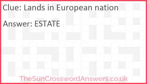Lands in European nation is a crossword clue for which we have 1 possible answer and we have spotted 2 times in our database. This crossword clue was last seen on 15 March 2023 in The Sun Cryptic Crossword puzzle!