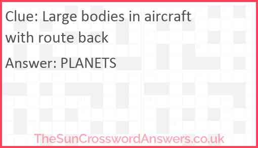 Large bodies in aircraft with route back is a crossword clue for which we have 1 possible answer and we have spotted 2 times in our database. This crossword clue was last seen on 13 July 2023 in The Sun Cryptic Crossword puzzle!