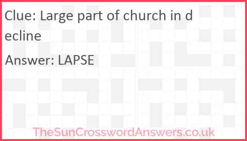 Large part of church in decline is a crossword clue for which we have 1 possible answer and we have spotted 4 times in our database. This crossword clue was last seen on 01 December 2022 in The Sun Cryptic Crossword puzzle!