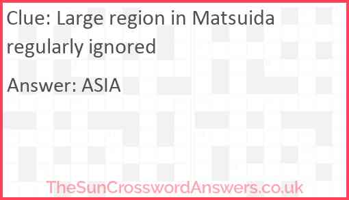Large region in Matsuida regularly ignored is a crossword clue for which we have 1 possible answer and we have spotted 1 times in our database. This crossword clue was last seen on 19 November 2024 in The Sun Cryptic Crossword puzzle!