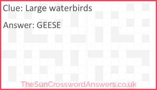 Large waterbirds is a crossword clue for which we have 1 possible answer and we have spotted 1 times in our database. This crossword clue was last seen on 24 September 2018 in The Sun Coffee Time Crossword puzzle!