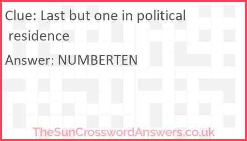 Last but one in political residence is a crossword clue for which we have 1 possible answer and we have spotted 2 times in our database. This crossword clue was last seen on 06 August 2023 in The Sun Cryptic Crossword puzzle!