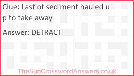 Last of sediment hauled up to take away is a crossword clue for which we have 1 possible answer and we have spotted 1 times in our database. This crossword clue was last seen on 20 February 2022 in The Sun Cryptic Crossword puzzle!
