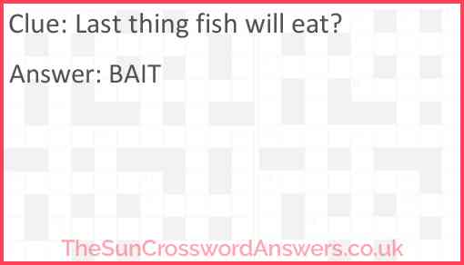 Last thing fish will eat? is a crossword clue for which we have 1 possible answer and we have spotted 3 times in our database. This crossword clue was last seen on 03 March 2025 in The Sun Cryptic Crossword puzzle!