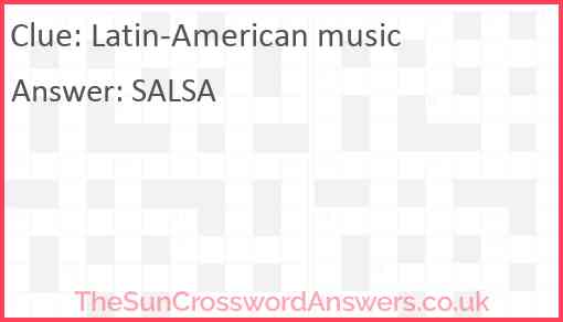 Latin-American music is a crossword clue for which we have 1 possible answer and we have spotted 2 times in our database. This crossword clue was last seen on 04 January 2024 in The Sun Coffee Time Crossword puzzle!