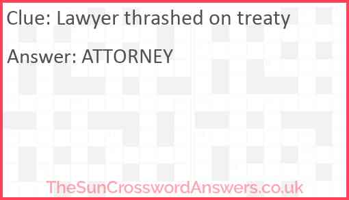 Lawyer thrashed on treaty is a crossword clue for which we have 1 possible answer and we have spotted 3 times in our database. This crossword clue was last seen on 25 May 2025 in The Sun Cryptic Crossword puzzle!
