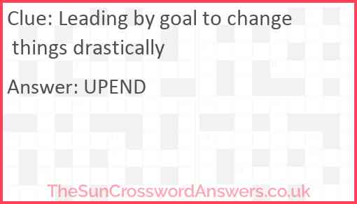 Leading by goal to change things drastically is a crossword clue for which we have 1 possible answer and we have spotted 1 times in our database. This crossword clue was last seen on 31 August 2020 in The Sun Cryptic Crossword puzzle!