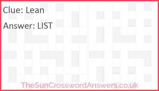 Lean is a crossword clue for which we have 2 possible answer and we have spotted 2 times in our database. This crossword clue was last seen on 30 August 2024 in The Sun Coffee Time Crossword puzzle!