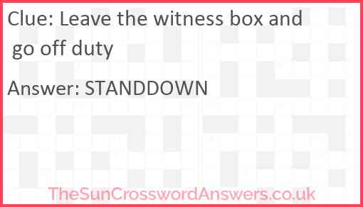 Leave the witness box and go off duty is a crossword clue for which we have 1 possible answer and we have spotted 1 times in our database. This crossword clue was last seen on 09 February 2025 in The Sun Cryptic Crossword puzzle!