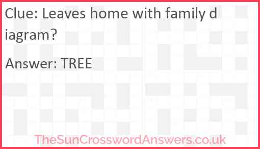 Leaves home with family diagram? is a crossword clue for which we have 1 possible answer and we have spotted 2 times in our database. This crossword clue was last seen on 03 June 2023 in The Sun Cryptic Crossword puzzle!