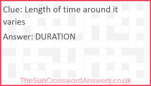 Length of time around it varies is a crossword clue for which we have 1 possible answer and we have spotted 2 times in our database. This crossword clue was last seen on 27 November 2022 in The Sun Cryptic Crossword puzzle!