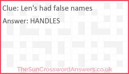 Len's had false names is a crossword clue for which we have 1 possible answer and we have spotted 1 times in our database. This crossword clue was last seen on 07 March 2022 in The Sun Cryptic Crossword puzzle!