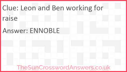 Leon and Ben working for raise is a crossword clue for which we have 1 possible answer and we have spotted 3 times in our database. This crossword clue was last seen on 18 January 2025 in The Sun Cryptic Crossword puzzle!