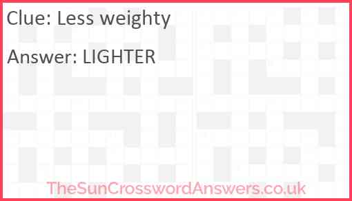 Less weighty is a crossword clue for which we have 1 possible answer and we have spotted 11 times in our database. This crossword clue was last seen on 02 May 2025 in The Sun Coffee Time Crossword puzzle!