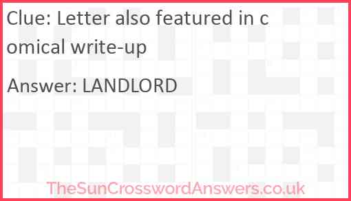 Letter also featured in comical write-up is a crossword clue for which we have 1 possible answer and we have spotted 3 times in our database. This crossword clue was last seen on 24 December 2023 in The Sun Cryptic Crossword puzzle!