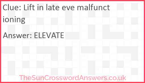 Lift in late eve malfunctioning is a crossword clue for which we have 1 possible answer and we have spotted 4 times in our database. This crossword clue was last seen on 31 July 2025 in The Sun Cryptic Crossword puzzle!