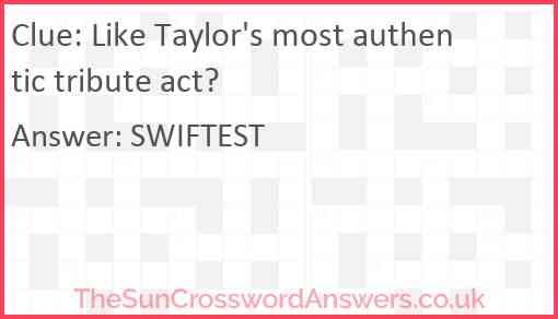 Like Taylor's most authentic tribute act? is a crossword clue for which we have 1 possible answer and we have spotted 1 times in our database. This crossword clue was last seen on 10 August 2024 in The Sun Cryptic Crossword puzzle!