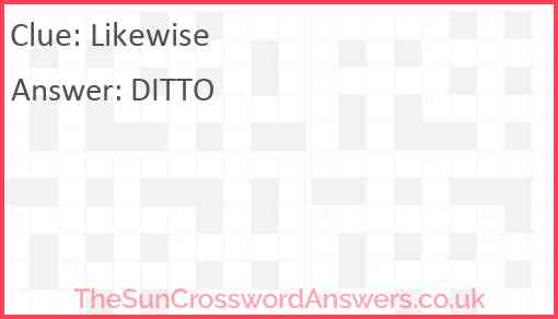 Likewise is a crossword clue for which we have 1 possible answer and we have spotted 2 times in our database. This crossword clue was last seen on 27 February 2024 in The Sun Coffee Time Crossword puzzle!