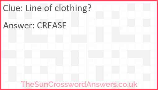 Line of clothing? is a crossword clue for which we have 1 possible answer and we have spotted 2 times in our database. This crossword clue was last seen on 12 February 2023 in The Sun Cryptic Crossword puzzle!