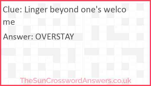 Linger beyond one's welcome is a crossword clue for which we have 1 possible answer and we have spotted 1 times in our database. This crossword clue was last seen on 12 March 2019 in The Sun Coffee Time Crossword puzzle!