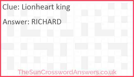 Lionheart king is a crossword clue for which we have 1 possible answer and we have spotted 1 times in our database. This crossword clue was last seen on 14 August 2021 in The Sun Coffee Time Crossword puzzle!
