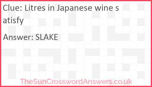 Litres in Japanese wine satisfy is a crossword clue for which we have 1 possible answer and we have spotted 2 times in our database. This crossword clue was last seen on 27 November 2024 in The Sun Cryptic Crossword puzzle!
